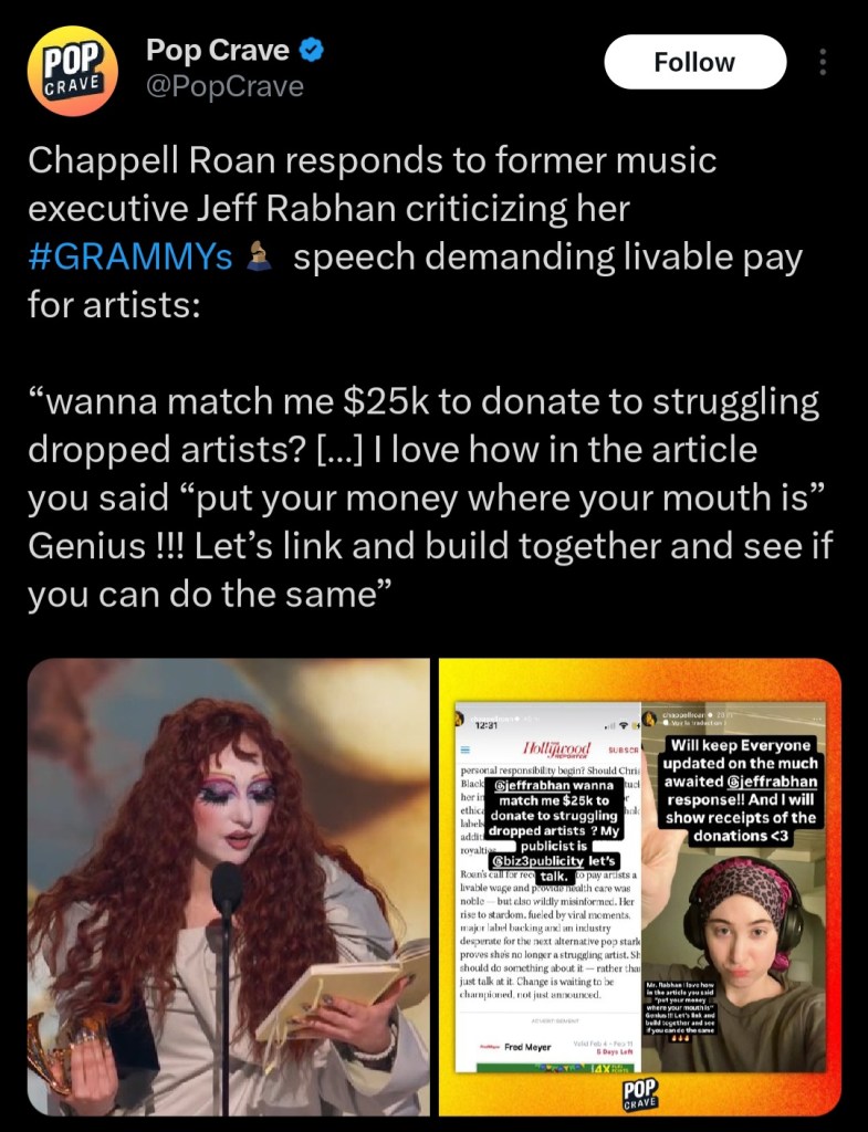 On Sunday night, February 2nd, Chappell Roan won New Artist. In her speech, which you can watch here: Chappel’s Speech, she discussed the struggles of a newly signed artist and how labels need to start providing a livable wage and healthcare. On February 5th, Jeff Rabhan wrote a response for the Hollywood Reporter which you can read here: Hollywood Reporter’s Article.