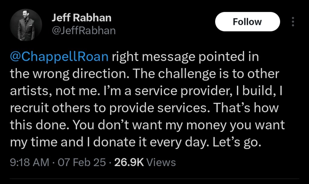 “@ChappellRoan right message pointed in the wrong direction. The challenge is to other artists, not me. I’m a service provider, I build, I recruit others to provide services. That’s how this done. You don’t want my money you want my time and I donate it every day. Let’s go.”