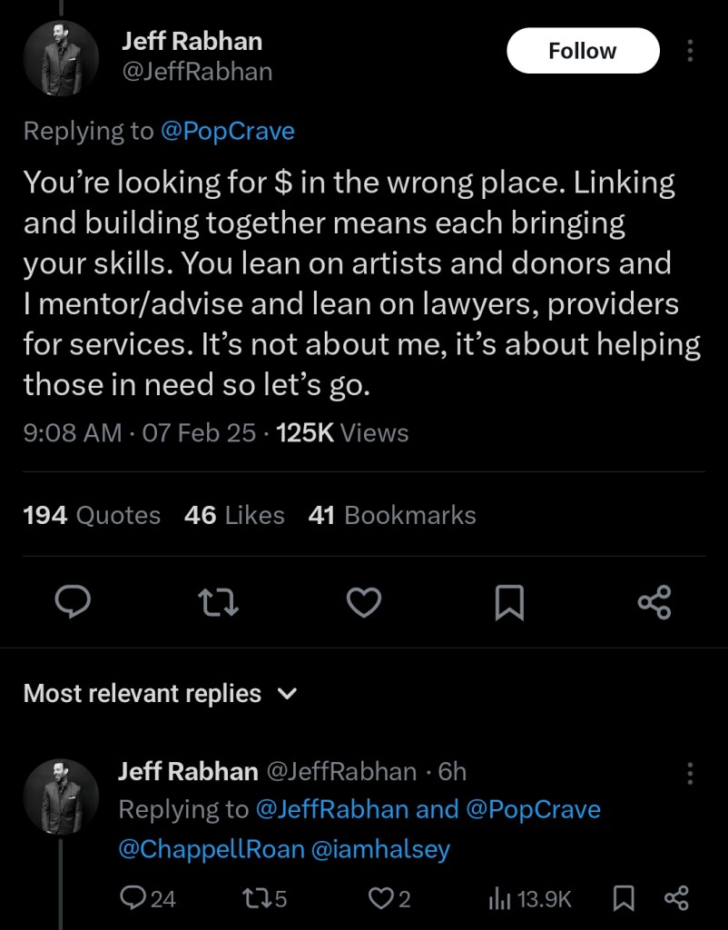 Jeff, you keep saying “let’s go” in your tweets, but go where? You’re not actively trying to work with these artists, you’re telling them what to do. If you wanted to “go” and do something about it, you would be contacting these artist’s teams to set something up instead of publicly taking it to social media.