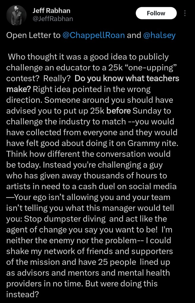 “Instead you’re challenging a guy who has given away thousands of hours to artists in need to a cash duel on social media—Your ego isn’t allowing you and your team isn’t telling you what this manager would tell you: Stop dumpster diving and act like the agent of change you say you want to be!”