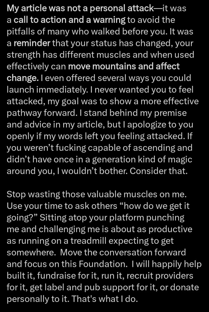 “I never wanted you to feel attacked, my goal was to show a more effective pathway forward. I stand behind my premise and advice in my article, but I apologize to you openly if my words left you feeling attacked. If you weren’t fucking capable of ascending and didn’t have once in a generation kind of magic around you, I wouldn’t bother. Consider that.”