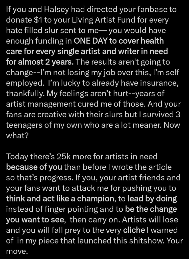“If you and Halsey had directed your fanbase to donate $1 to your Living Artist Fund for every hate filled slur sent to me— you would have enough funding in ONE DAY to cover health care for every single artist and writer in need for almost 2 years.”